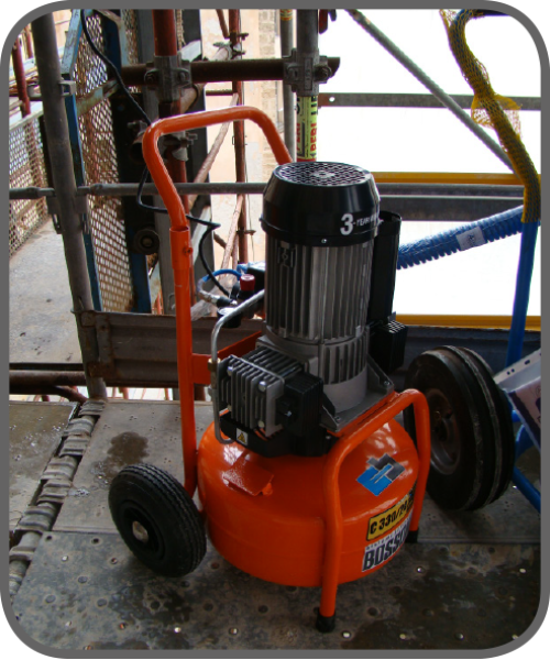 • compressore professionale a secco (senza olio), capacità 24 lt, con raccordi a servizio del serbatoio di iniezione