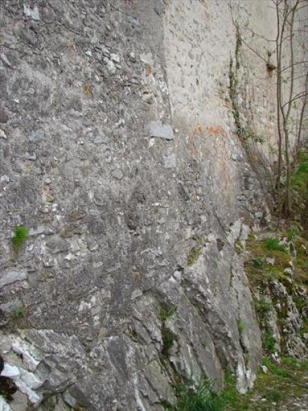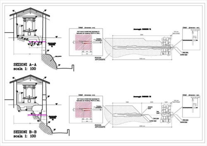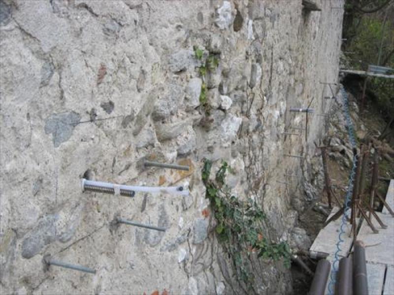 - ancoraggi orizzontali ciechi iniettati con calza per cucitura parete perimetrale e roccia in fondazione - lunghezza 4,50m - inghisati in corrispondenza del substrato roccioso, con iniezioni effettuate dalla sola testa dell’ancoraggio e successivo posizionamento di piastra di ancoraggio all’estremità.