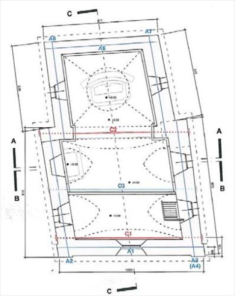 - ancoraggi orizzontali ciechi e passanti iniettati con singolo o doppio bulbo di malta per la cerchiatura del corpo principale della chiesa - lunghezza totale da 7,00 a 10,15m - inseriti nello spessore della muratura perimetrale della navata, con iniezioni effettuate dalla sola testa dell’ancoraggio per gli ancoraggi ciechi e da entrambe le estremità per gli ancoraggi passanti con doppio bulbo;