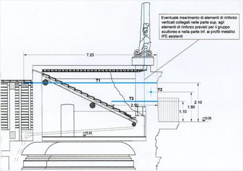 L’articolata conformazione del parapetto con diverse parti in aggetto e la presenza dei due gruppi scultorei in sommità, esposti all’azione del vento hanno contribuito alla formazione di lesioni che denunciano un distacco tra la porzione frontale e le due ali laterali del coronamento, come dimostrano le visibili lesioni inclinate di 45°.