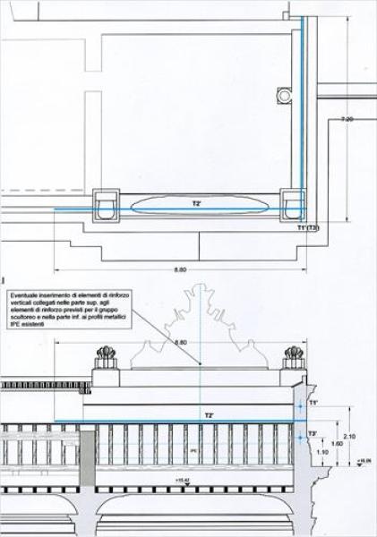 La necessità di ricostituire la continuità della muratura che costituisce il coronamento e di cucire le lesioni esistenti ha portato ad intervenire mediante l’inserimento di ancoraggi orizzontali in corrispondenza sia dei parapetti laterali che frontali, posti ad una distanza di 50 cm uno dall’altro che si incrociano in corrispondenza dell’angolo.