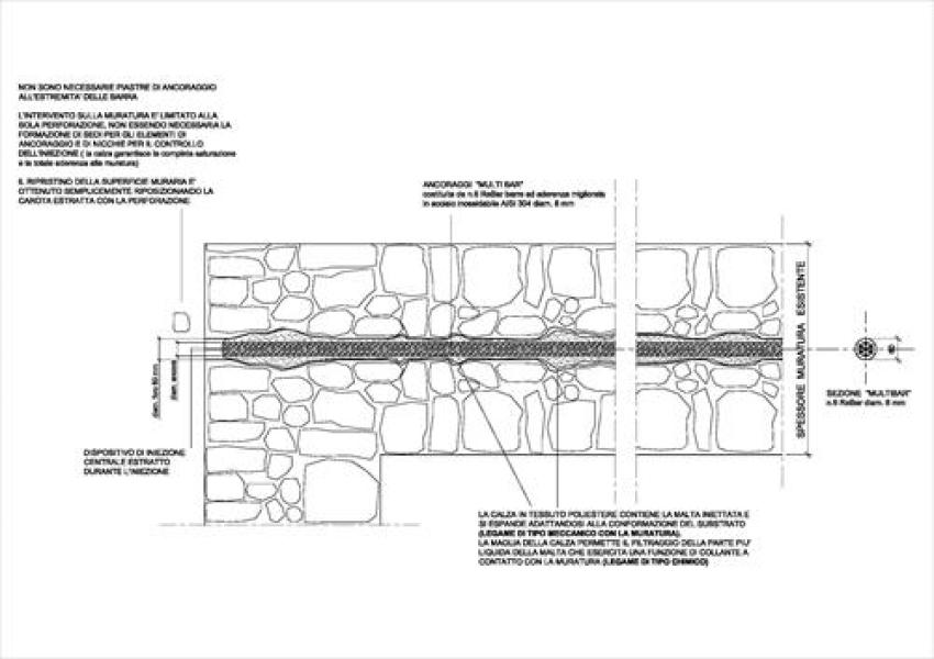 Inoltre la possibilità di evitare l’applicazione di elementi di ancoraggio alle estremità della barra, quali capochiave a chiavistello o piastre, permette di effettuare un intervento che garantisce il mantenimento inalterato dell’aspetto originario del manufatto ed evita di danneggiare la cortina muraria esistente anche grazie al riposizionamento della carota estratta durante la fase di perforazione.