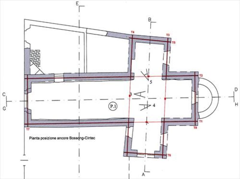 L’intervento di consolidamento con tecnologia Bossong, che fa parte di un più ampio piano di recupero dell’edificio (comprendente rifacimento delle sottomurazioni, della copertura lignea, degli intonaci, delle pavimentazioni ecc.), è stato impiegato, come evidenziato nel progetto di interventi, per la cucitura delle lesioni esistenti e la connessione tra le pareti perimetrali, trasversali e longitudinali, tramite l’inserimento di barre in acciaio inox, inserite nello spessore della muratura, previa perforazione mediante sonda diamantata, in asse alla muratura.