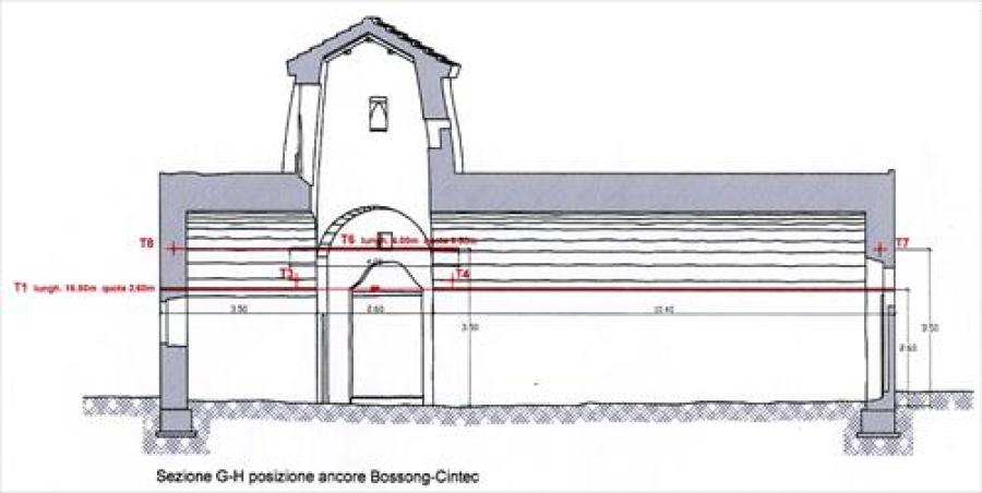 • ancoraggi orizzontali passanti con doppio bulbo di malta inghisati, tramite manicotto tenditore, nella parte di barra a vista in corrispondenza dell’apertura dell’arcata del transetto, ad ancoraggio cieco iniettato con calza per il consolidamento delle murature perimetrali della navata principale - lunghezza totale 16,50m (11,70m+4,80m)- inseriti nello spessore della muratura, con iniezioni effettuate da entrambe le estremità dell’ancoraggio e manicotto tenditore di giunzione a vista;